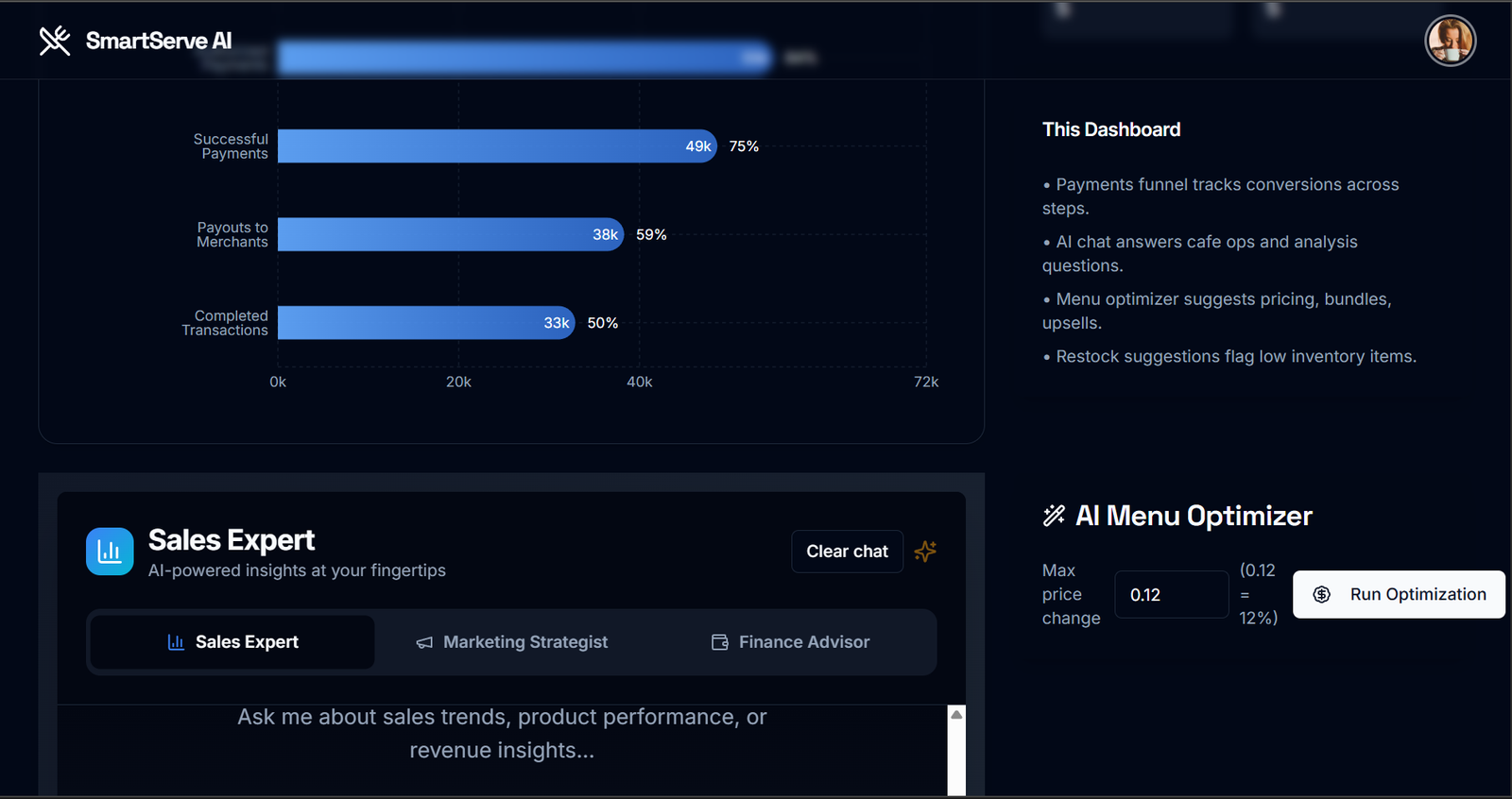 An AI-powered analytics and visualization dashboard for business intelligence and menu optimization.